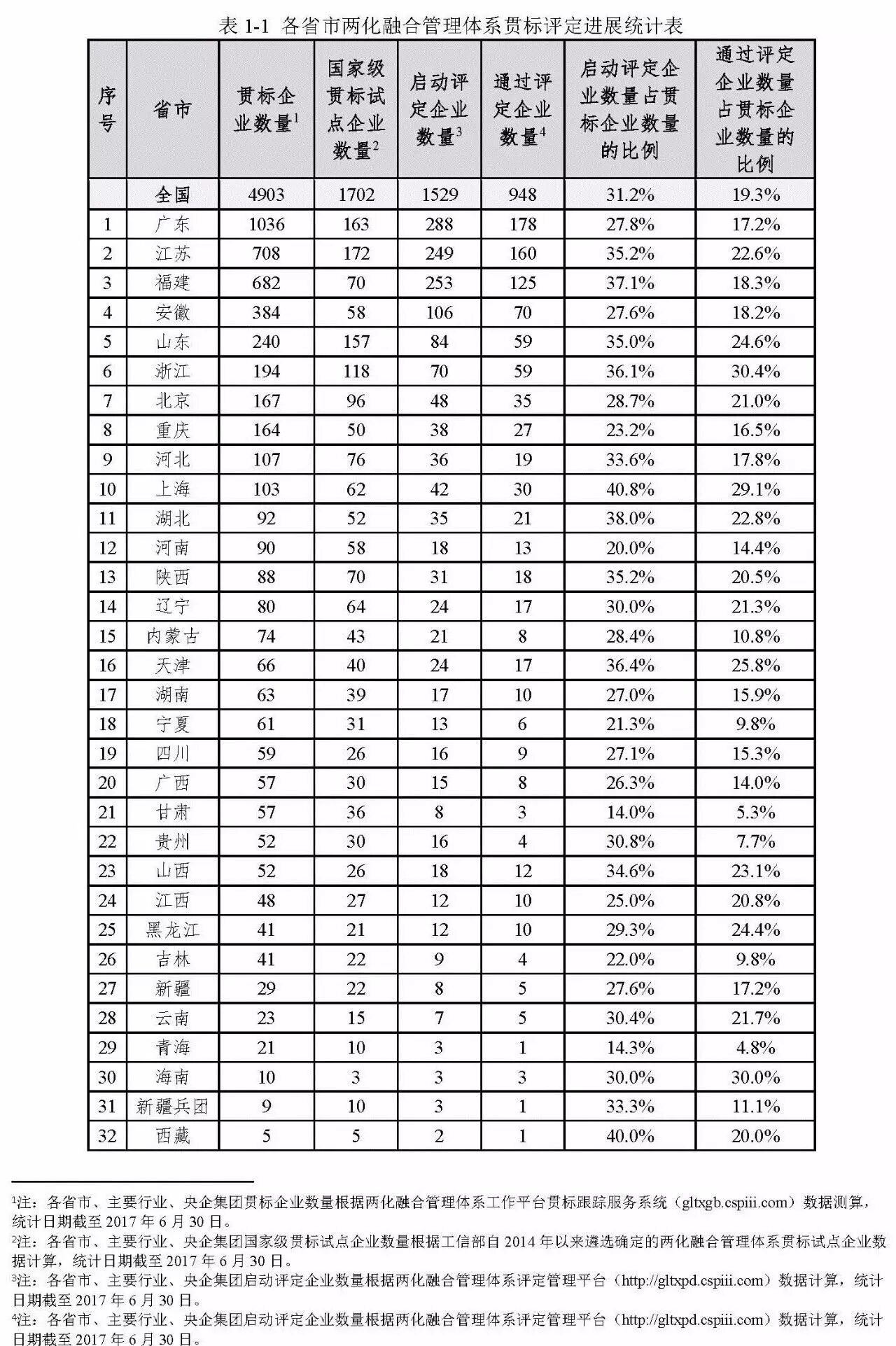按照《工业和信息化部办公厅关于持续开展企业两化融合评估诊断和对标引导工作的通知》(工信厅信软函〔2016〕269)工作部署,各省工信主管部门应按年度周期性组织开展企业两化融合评估诊断和对标引导工作,每年6月底前组织辖区内企业依托中国两化融合服务平台的各省级评估服务分平台(www.cspiii.com/pg/)完成两化融合评估诊断工作,每个省级单位参评企业数量不少于1000家或不少于列入国家统计监测的规模以上工业企业数量的50%,研制形成本省市两化融合数据地图,组织开展数据地图应用推广工作,推动形成以数据为核心的精准施策新模式。截至2017年6月30日,全国已有74123家企业开展了自评估、自诊断、自对标。